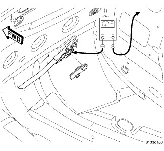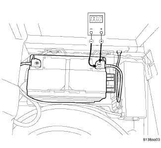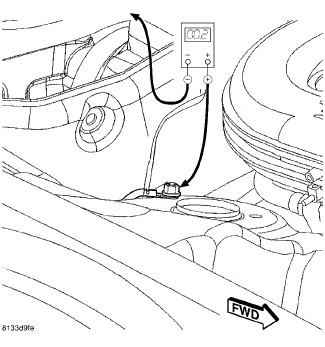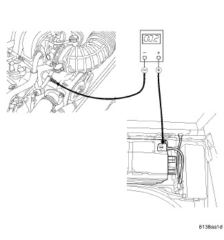 1. Remove the spare tire cover to gain access to the battery. Connect the positive lead of the voltmeter to the battery negative terminal post. Connect the negative lead of the voltmeter to the battery negative cable terminal clamp. Rotate and hold the ignition switch in the Start position. Observe the voltmeter. If voltage is detected, correct the poor connection between the battery negative cable terminal clamp and the battery negative terminal post.
