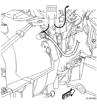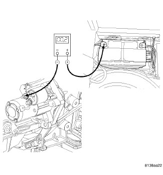 5. Connect the voltmeter to measure between the battery negative cable eyelet terminal connection at the right front strut tower and the battery negative cable eyelet terminal connection at the transmission housing. Rotate and hold the ignition switch in the Start position. Observe the voltmeter. If the reading is above 0.2 volt, clean and tighten the battery negative cable eyelet terminal connection at the right front strut tower. Repeat the test. If the reading is still above 0.2 volt, replace the battery front negative cable, Battery Cables - Removal.