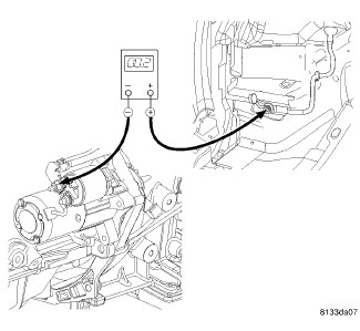 6. Using a suitable jumper wire, connect the voltmeter to measure between the battery positive cable terminal clamp and the starter solenoid B(+) terminal stud. Rotate and hold the ignition switch in the Start position. Observe the voltmeter. If the reading is above 0.2 volt, clean and tighten the battery positive cable eyelet terminal connection at the starter solenoid B(+) terminal stud. Repeat the test. If the reading is still above 0.2 volt, perform 7 and 8.
