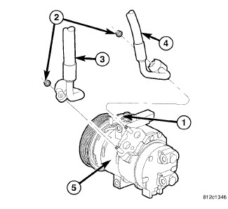 10. Connect the suction and discharge lines onto the A/C compressor (5).