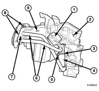 1. Install the heater core (4) into the driver side of the air distribution housing (2) and engage the heater core tubes (6) to the foam seal at the front of the HVAC housing (9).