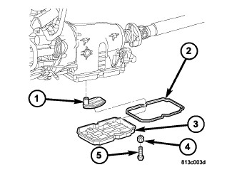 8. Install the oil pan (3) and gasket (2) onto the transmission.