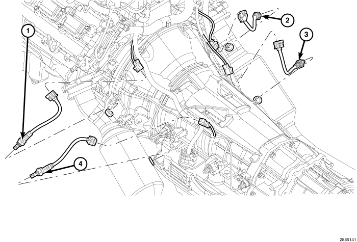 1. Using the appropriate oxygen sensor removal/installation tool, install the O2S sensors (3,4) and tighten to 41 Nm (30 ft. lbs.).