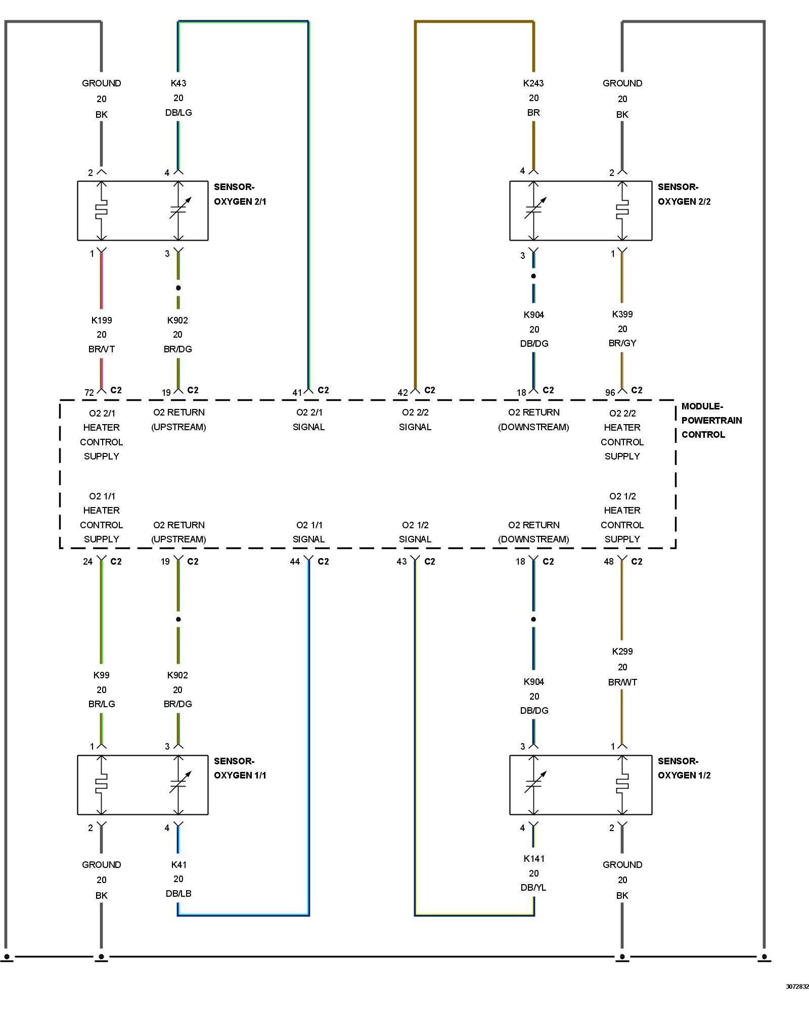 1. Using the wiring diagram/schematic as a guide, inspect the wiring and connectors between the O2 Sensor and the PCM.