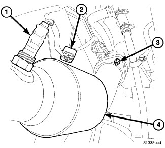 1. Position the catalytic converter (4) onto the exhaust manifold flange, install ball flange nuts (3) finger tight.