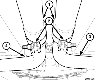 3. Position the front exhaust pipe band clamps (2) on the exhaust pipe/muffler and resonator assembly (1).