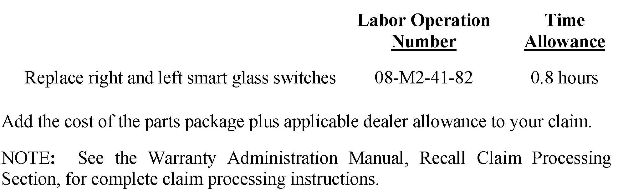 The smart glass switch on about 8,400 of the above vehicles may have improper heat stakes which could cause a continuous unintended smart glass operation. Continuous activation of the smart glass feature, when not intended, could cause the battery to discharge to a point where the engine will not crank.