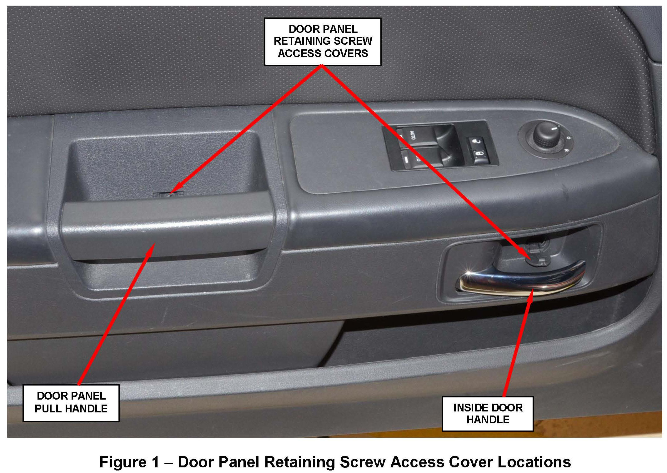 a. Open the door panel retaining screw access cover located by the inside door handle and then remove and save the door panel retaining screw (Figure 1).