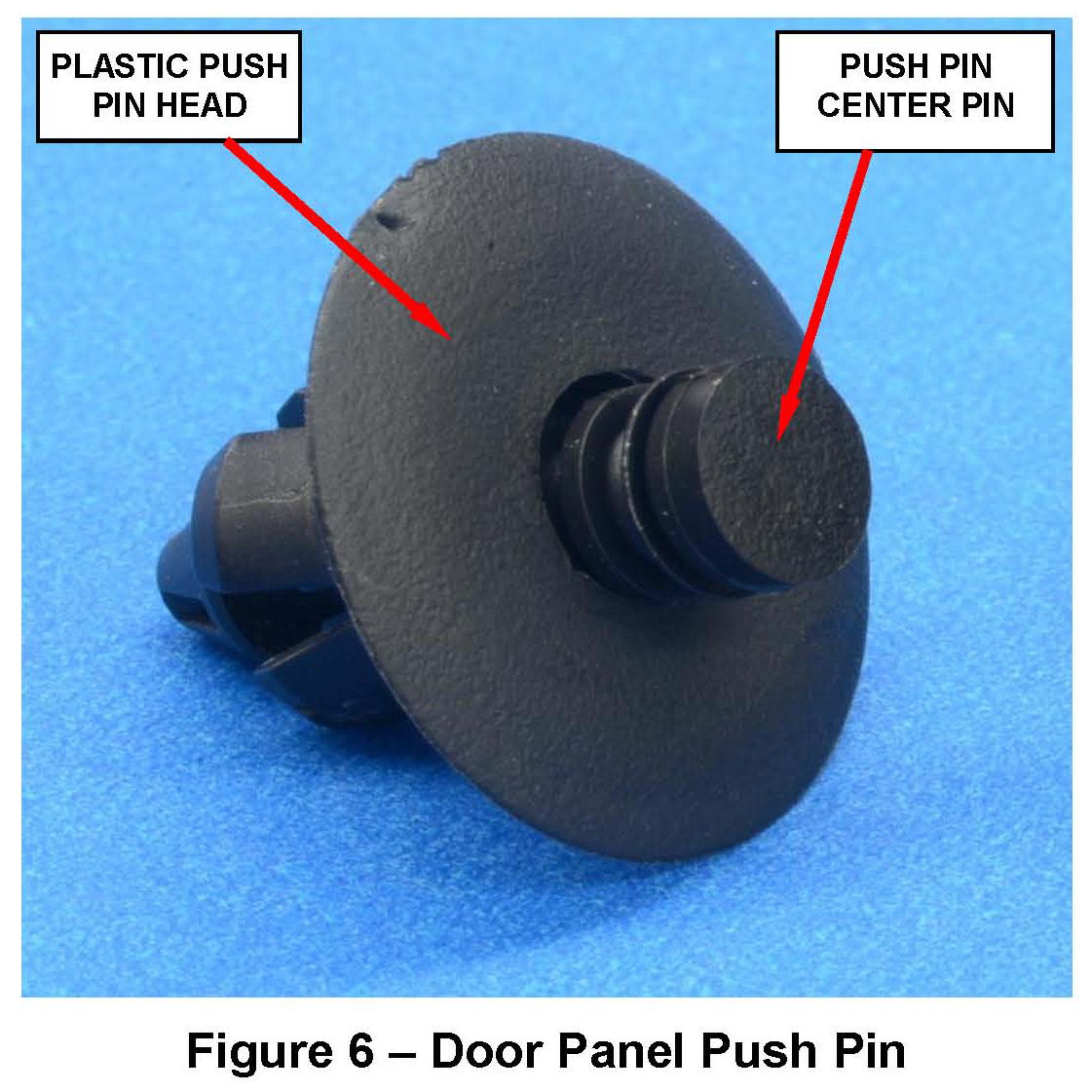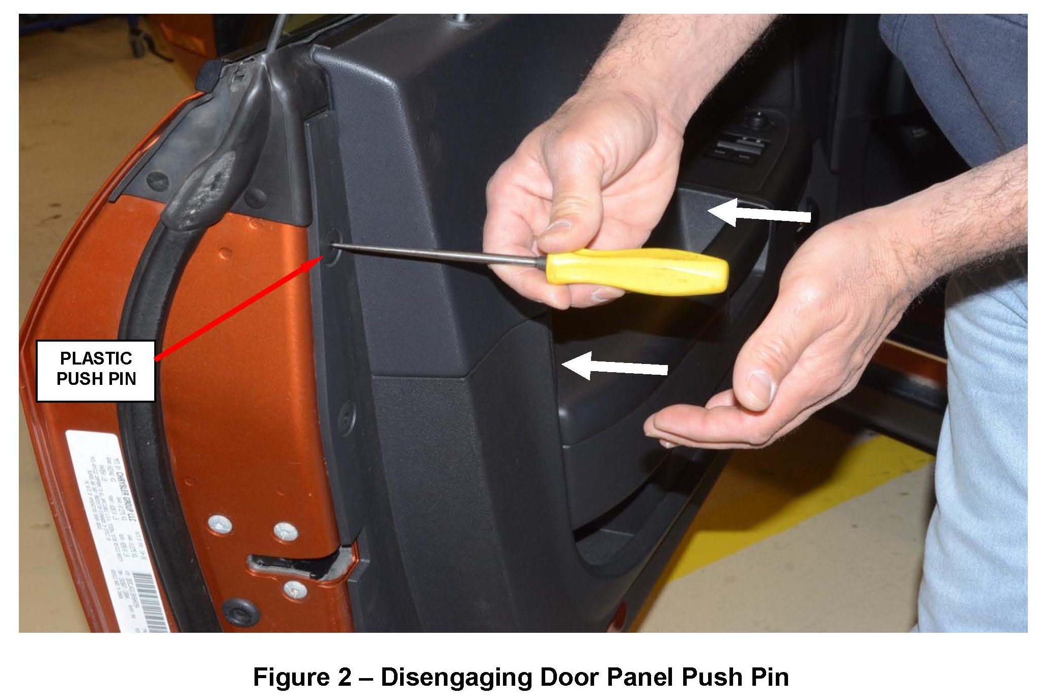 c. Carefully push the center pin on the seven door panel perimeter plastic push pins in about 1/8" to disengage the push pin (Figure 2).