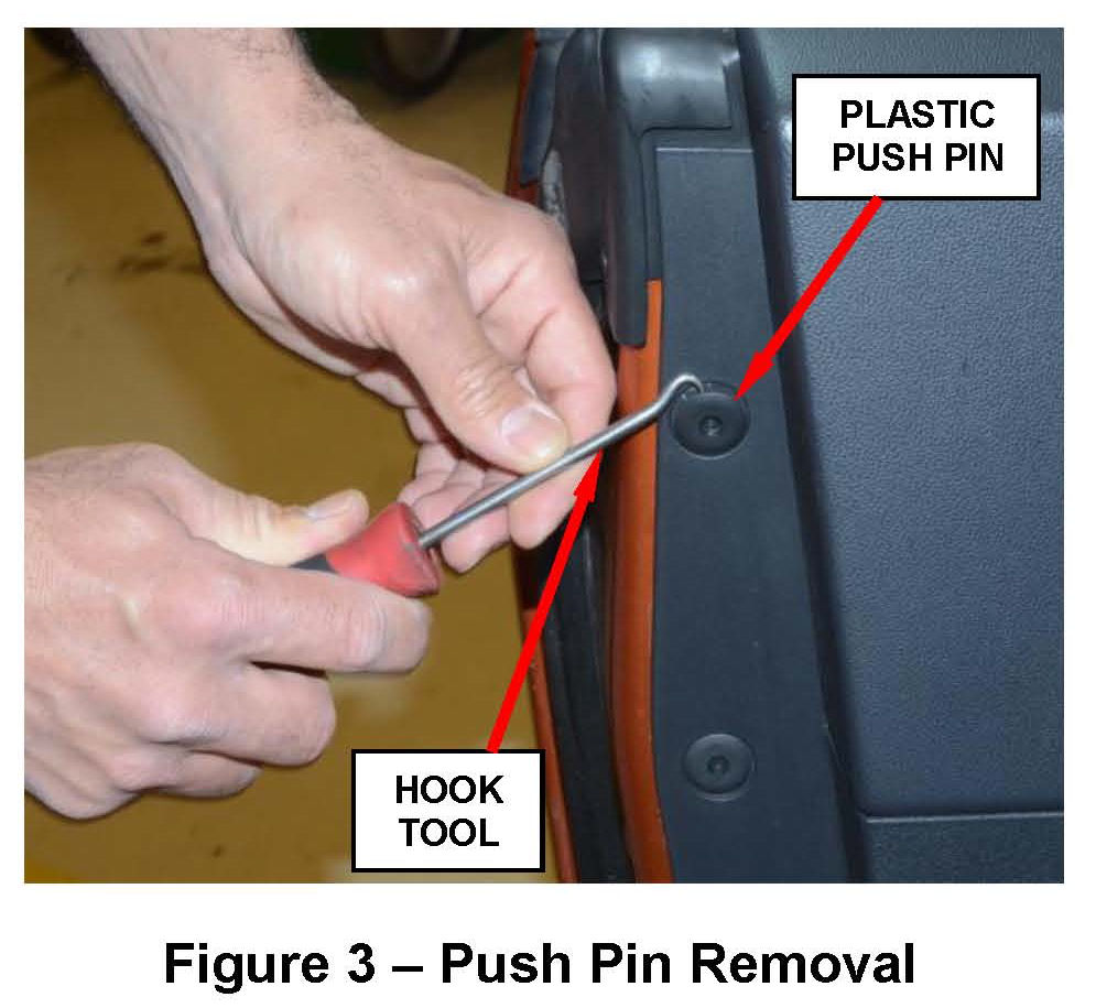 d. Using a hook tool, carefully remove and save the seven door panel perimeter push pins (Figure 3).