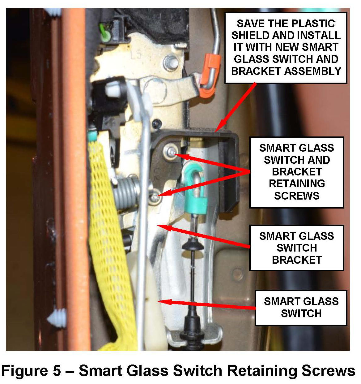 5. Carefully remove and save the two screws that hold the smart glass switch and switch bracket to the door latch (Figure 5).