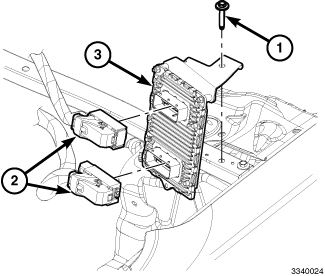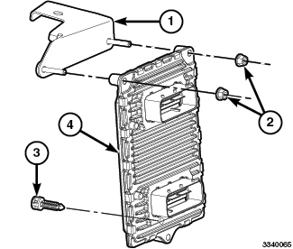 1. If removed, position the Powertrain Control Module (PCM) mounting bracket (1) onto the PCM (4), install the two retaining nuts (2) and tighten to 8 Nm (71 in. lbs.).