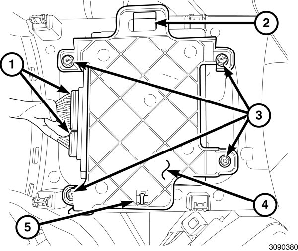 1. Install the Vehicle System Interface Module (VSIM) onto the mounting bracket (4) by inserting the locating tab (2) and rotating the VSIM downward until the retaining clip (5) is securely snapped into place.