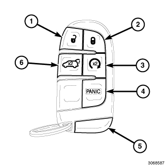 Vehicles are shipped from the factory with two FOB with Integrated Key (FOBIK) Remote Keyless Entry (RKE) transmitters programmed to the vehicle as standard equipment. The FOBIK circuitry is contained and protected within a molded black plastic case with a black soft rubber touch pad on the face divided into six sections. The rearward end of the FOBIK case houses a mechanical, metal, coded emergency key (5) that is released by sliding a latch button on the back of the FOBIK case.