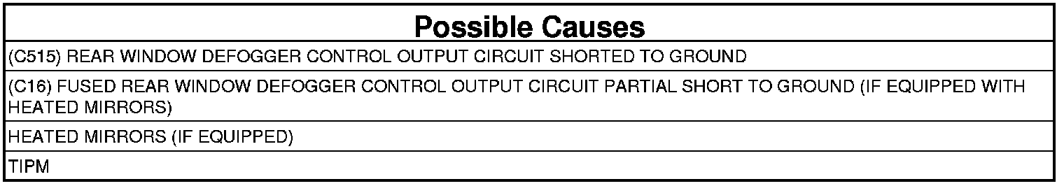 A shorted low condition on the (C515) Rear Defogger Control Output or (C16) Fused Rear Defogger Control Output circuit.
