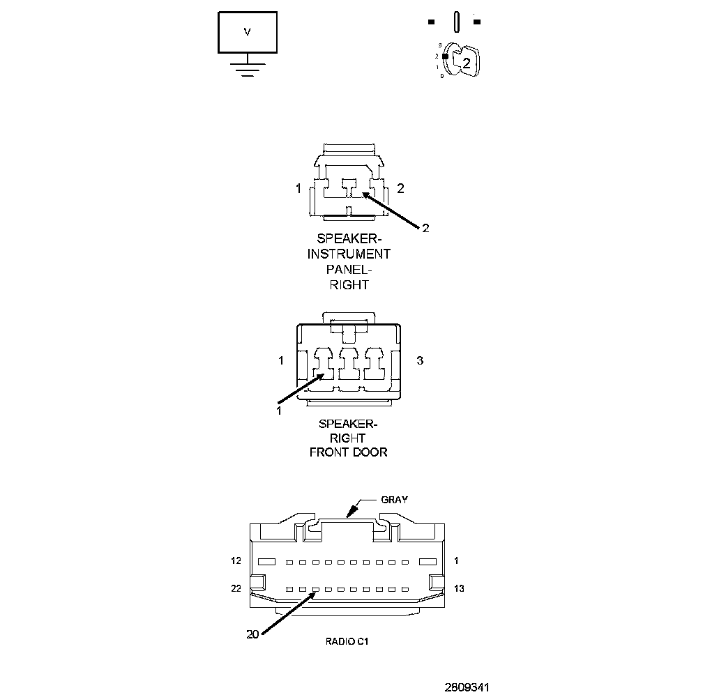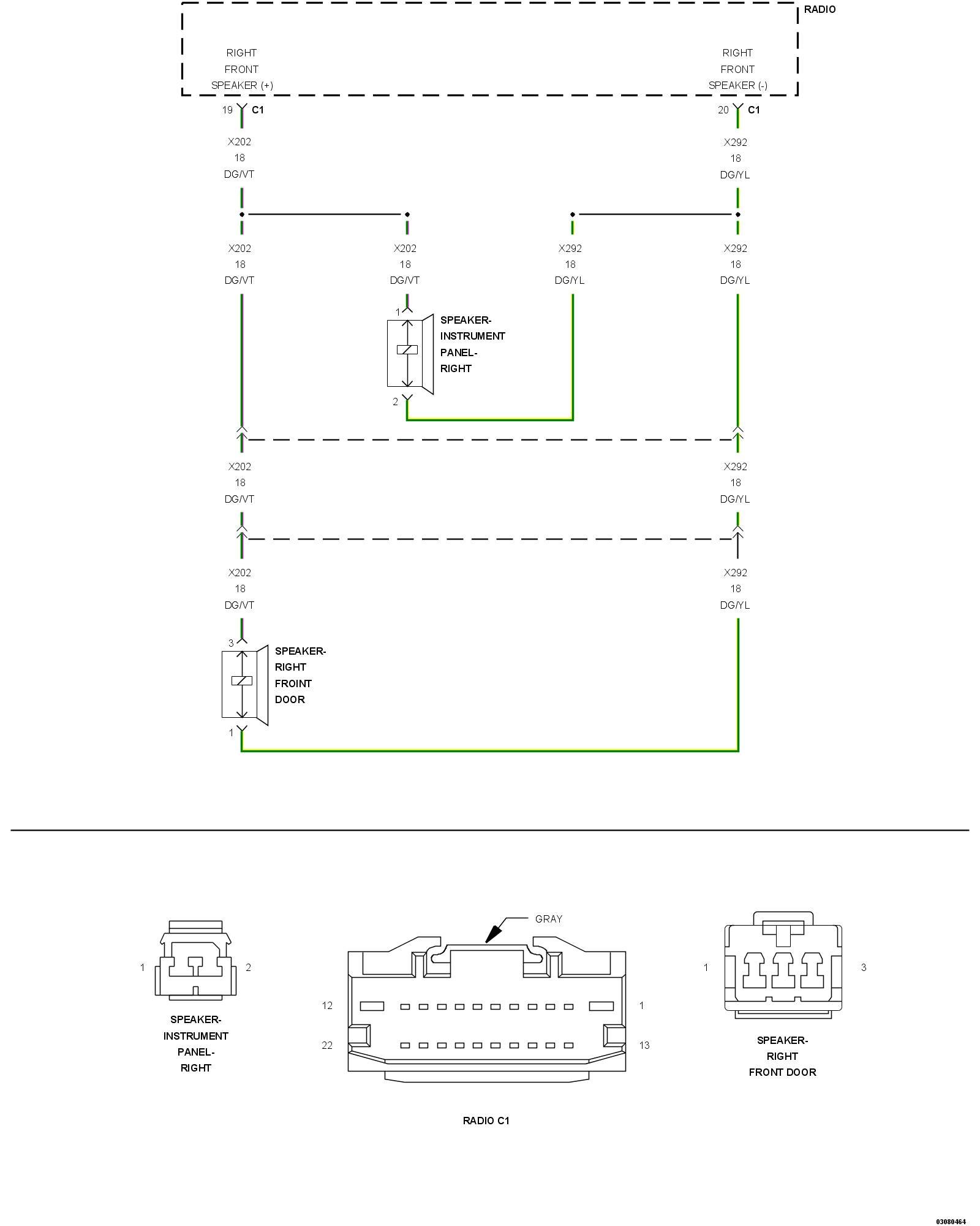 The (X202) Right Front Speaker (+) circuit and the (X292) Right Front Speaker (-) circuit are outputs of the Radio. The Radio controls and monitors these circuits for a concern.