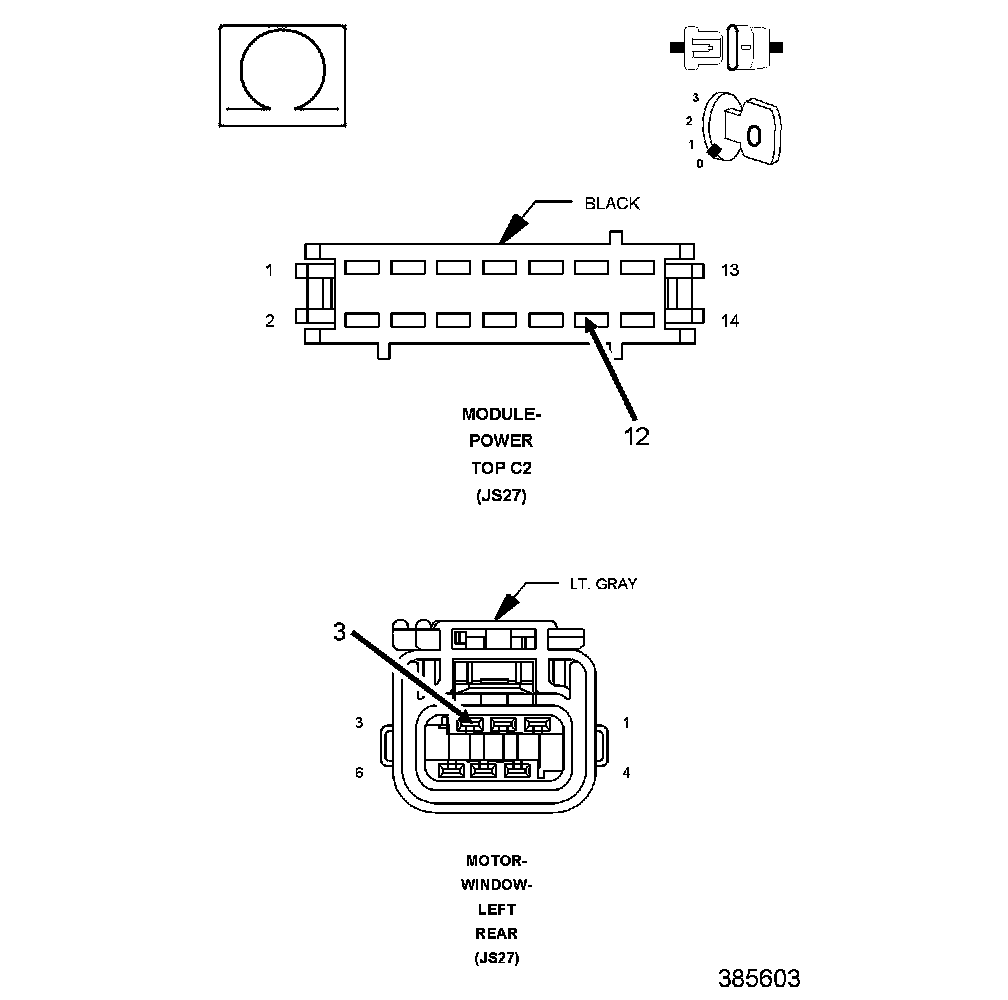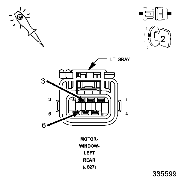 3. Connect the other end of the 12-volt test light to the (Q211) Left Rear Window Driver (Down) circuit in the motor connector.