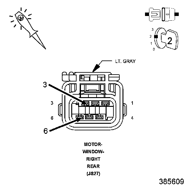 3. Connect the other end of the 12-volt test light to the (Q212) Right Rear Window Driver (Down) circuit in the motor connector.
