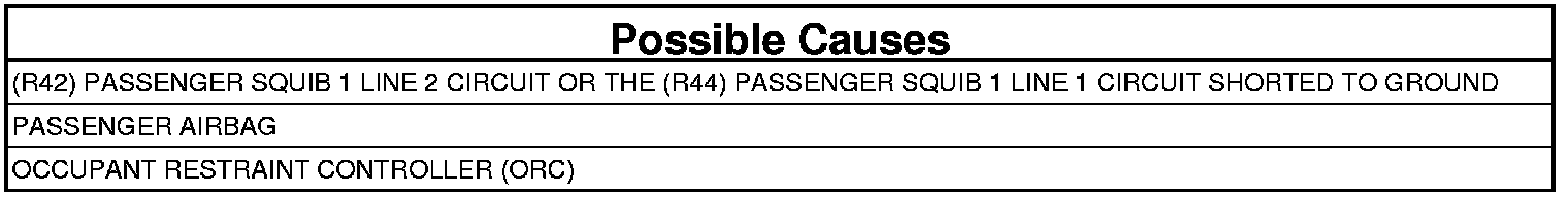 The Occupant Restraint Controller (ORC) monitors the resistance of the Passenger Squib 1 circuits. The ORC will set this DTC if it detects low resistance on the Passenger Squib 1 circuits.