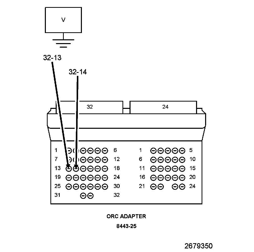 5. Measure the voltage of the (R54) Passenger Seat Belt Tensioner Line 2 circuit between the SRS Load Tool Adapter cavity 32-14 and ground.
