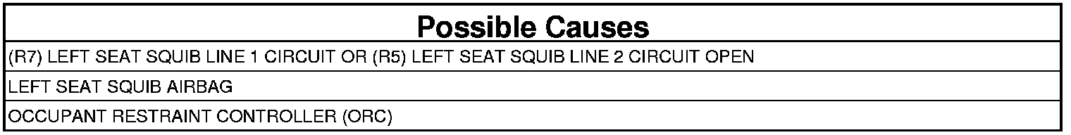 - Repair the (R7) Left Seat Squib Line 1 circuit for a short to the (R5) Left Seat Squib Line 2 circuit.