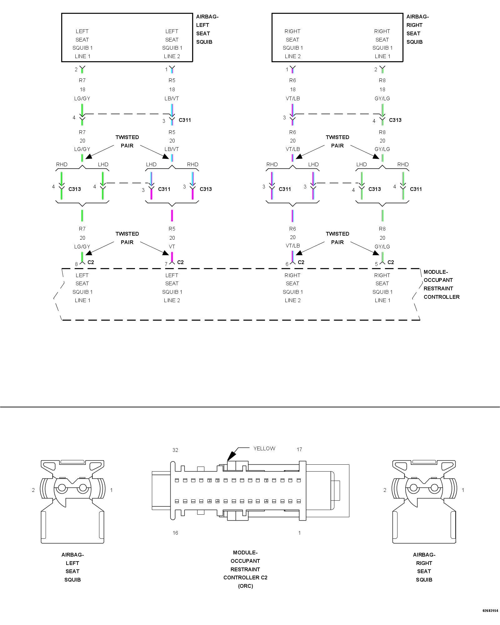 The Occupant Restraint Controller (ORC) monitors the voltage on the Right Seat Squib circuits. The ORC will set this DTC if it detects voltage on the Right Seat Squib circuits.