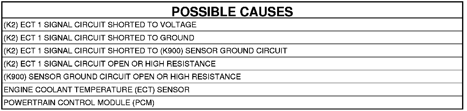 5. (K2) ECT 1 SIGNAL CIRCUIT SHORTED TO THE (K900) SENSOR GROUND CIRCUIT