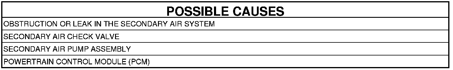 The Secondary Air Injection System reduces hydrocarbon emissions by decreasing the catalyst warm up time. During a cold engine start, after a short diagnostic time out, typically two to three seconds, the Powertrain Control Module (PCM) commands the Secondary Air Pump on for approximately 20 seconds. The Secondary Air Pump supplies air to the exhaust manifold through the Secondary Air Pump Valve, a one-way check valve. This additional air introduced to the exhaust flow aids in the warm up of the catalyst.