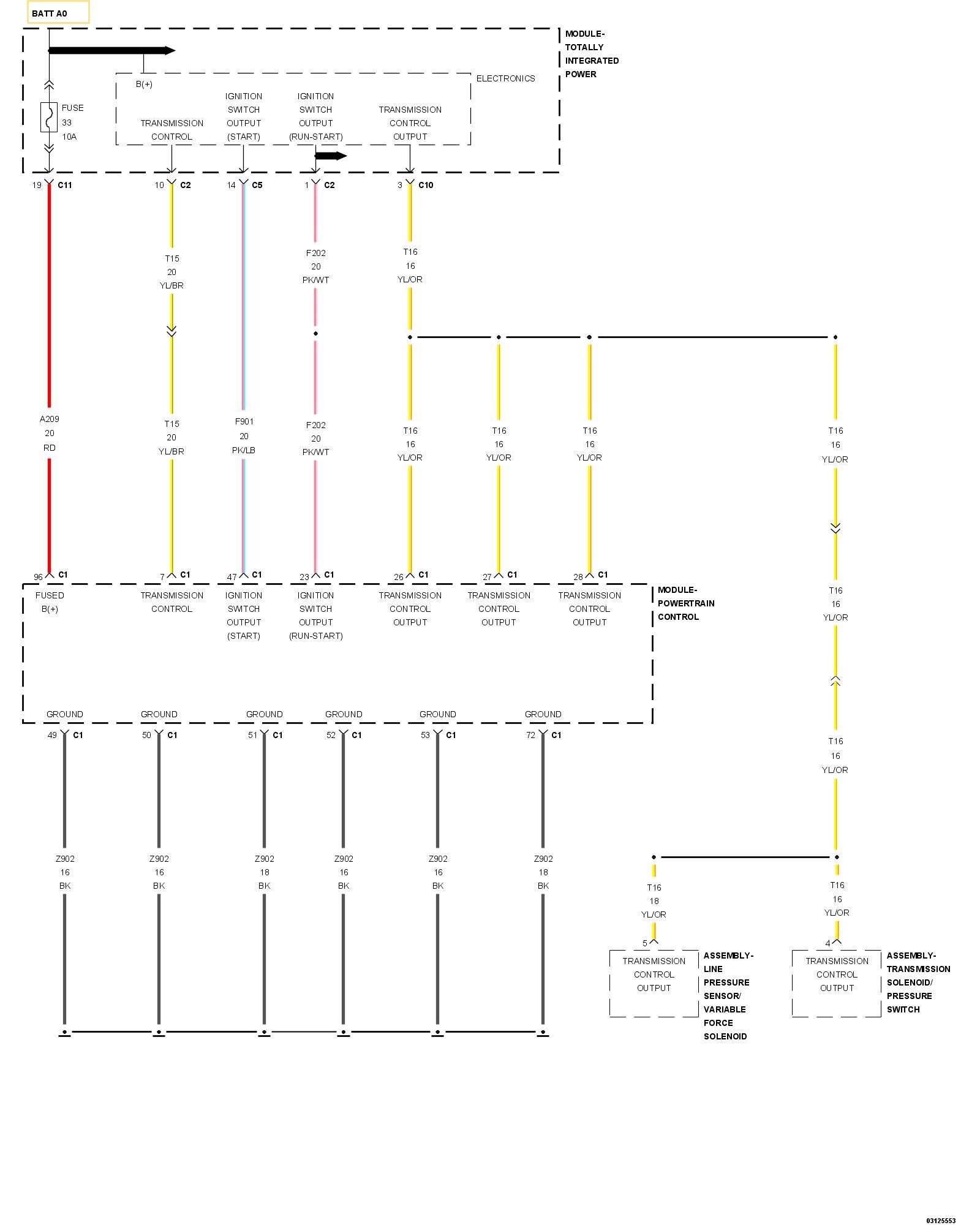 The Transmission Control Output circuit is used to supply power to the Powertrain Control Module (PCM), Transmission Solenoid/Pressure Switch Assembly, Transmission Range Sensor (TRS) and the Line Pressure Sensor/Variable Force Solenoid when in normal operating mode. The purpose of the Transmission Output circuit is to allow the Transmission Control System to turn off the power to these components in the event that the transmission should need to be placed into "limp-in" mode due to a DTC.