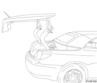 NOTE: This procedure is not necessary in it's entirety if the decklid will tilt rearward with the power folding top switch. In this case stop the folding top open event prior to the decklid leading edge closing downward and release the conventional decklid latch with the latch release cable. Proceed to 4 for the remainder of the procedure.