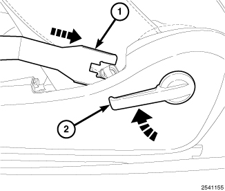 2. Using a door handle clip tool (1) or equivalent through the seat belt opening of the side cover, rotate the handle (2) up and release the clip using the clip tool (1).