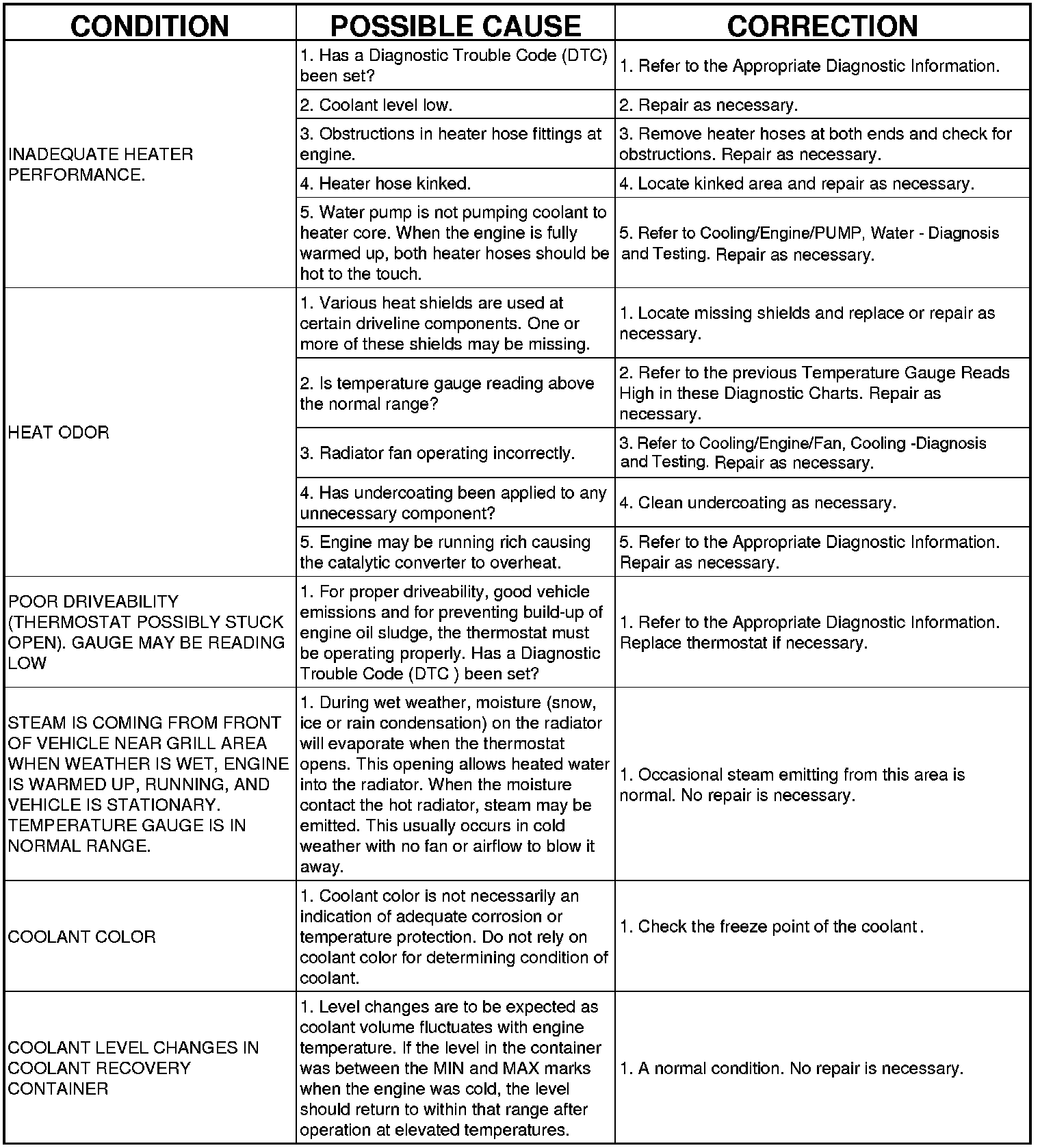 NOTE: If investigation reveals none of the previous items as a cause for an engine overheating complaint, refer to the COOLING SYSTEM DIAGNOSIS CHART.