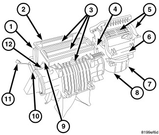 All vehicles are equipped with a common heater, ventilation and air conditioning (HVAC) housing (1). The heating-A/C system combines A/C, heating, and ventilating capabilities in a single HVAC housing mounted within the passenger compartment beneath the instrument panel. The HVAC housing includes:
