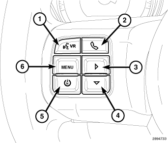 The Electronic Vehicle Information Center (EVIC) control switch pod is located in the left spoke of the steering wheel spoke bezel. This switch has up to six push buttons. Four of the push buttons (3 through 6) are used on all vehicles equipped with the EVIC and two of the push buttons (7 and 8) are used on vehicles not equipped with the EVIC. Two additional push buttons (1 and 2) are found on vehicles equipped with the optional Uconnect(TM) Hands-Free Communication System. The only visible components of the switch pod are the switch push buttons and a decorative bezel around the push buttons, which stands slightly proud of the steering wheel spoke bezel. The remainder of the switch pod including its mounting provisions and its electrical connection are concealed beneath the spoke bezel.