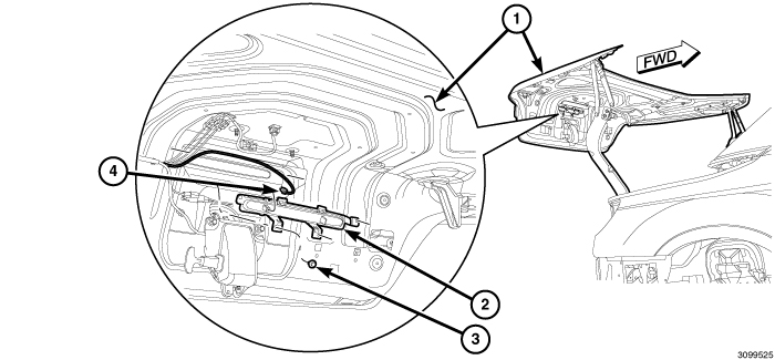 1. The deck lid (1) must be placed in the service position to perform the following procedure. . Convertible - Decklid Service Position