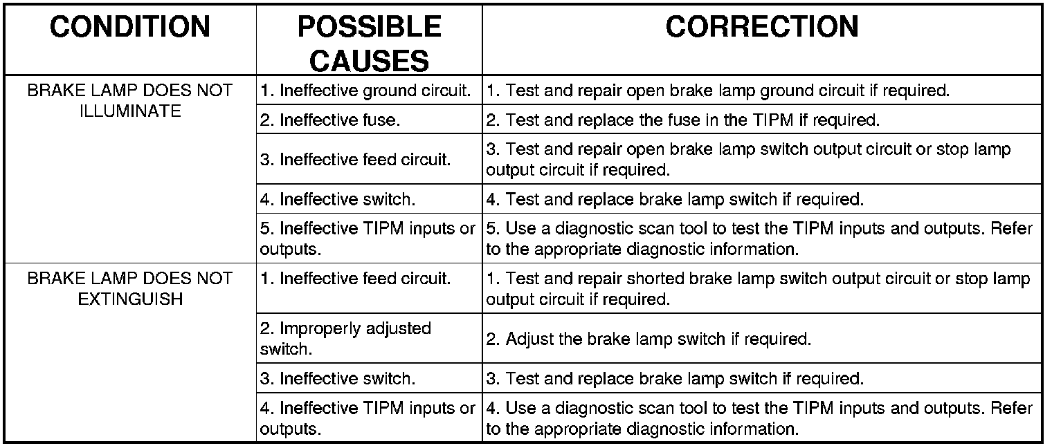 NOTE: The brake lamps and the Center High Mounted Stop Lamp (CHMSL) are illuminated by several Light-Emitting Diode (LED) units that are soldered to the electronic circuit board within the lamp housing. The CHMSL is hard wired to the output of the brake lamp switch, while the brake lamps are powered by high side drivers within the TIPM based upon an input from the brake lamp switch. If the brake lamps and all of the LED units within the CHMSL fail to operate, diagnose and repair the brake lamps before attempting to repair the CHMSL. If the brake lamps operate but none of the CHMSL LED units illuminate, test and repair the CHMSL ground or feed circuit if required. If some of the CHMSL LED units operate and others do not, the CHMSL assembly must be replaced with a new unit.