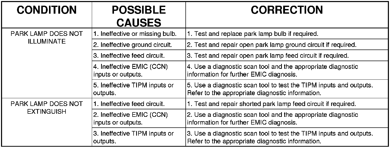 NOTE: As part of the exterior lighting failsafe feature, upon ignition ON, all exterior park lamps and the headlamp low beams will illuminate regardless of the left multi-function switch control knob position if the SCM cannot detect an input from the left multi-function switch, or if there is a loss of communication between the left multi-function switch/SCM and the EMIC or between the EMIC and the TIPM. Diagnose and repair those problems before attempting to repair the Park Lamps.