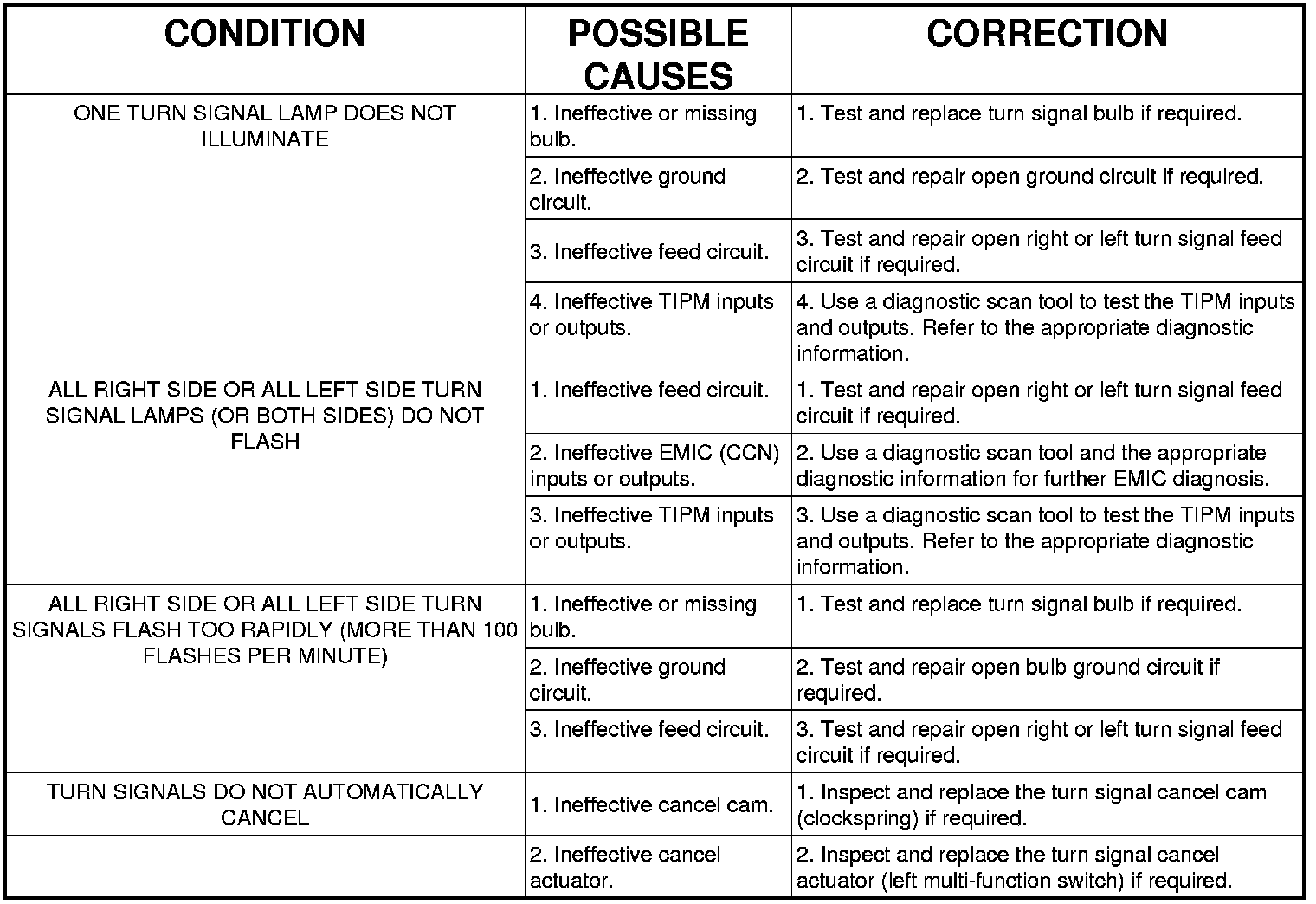 NOTE: The turn signal switch is integral to the left multi-function switch/SCM, which communicates with the EMIC/CCN over the LIN data bus. Before performing any of the following tests, determine whether the other functions of the left multi-function switch/SCM are operational. If the other left multi-function switch/SCM functions are ineffective, diagnose and repair that problem before attempting to repair the Turn Signal Lamps.
