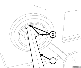 3. Insert Remover, Power Outlet (1) into the retaining bosses (2) of the power outlet.
