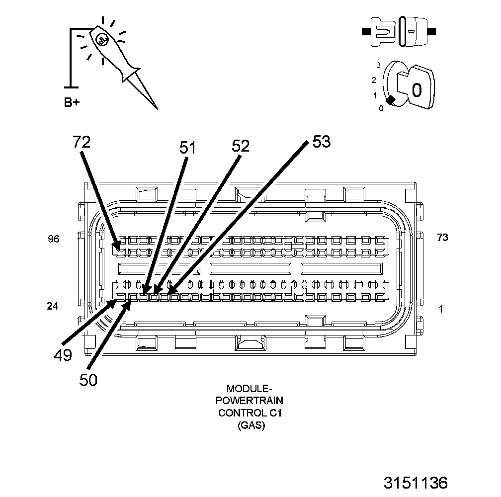 3. Using a 12-Volt test light connected to ground, probe the (A209) Fused B+ circuit in the PCM C1 harness connector.
