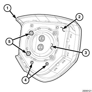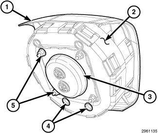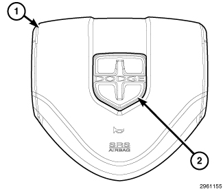 The injection molded, thermoplastic driver airbag protective trim cover (1) is the most visible part of the Driver AirBag (DAB). The DAB is located in the center of the steering wheel, where it is secured with screws to the floating horn switch within the hub cavity of the three-spoke steering wheel. An injection molded, bright Dodge emblem (2) is applied to the center of the trim cover.