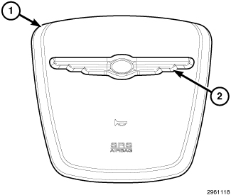 The injection molded, thermoplastic driver airbag protective trim cover (1) is the most visible part of the Driver AirBag (DAB). The DAB is located in the center of the steering wheel, where it is secured with screws to the floating horn switch within the hub cavity of the three-spoke steering wheel. An injection molded, bright emblem with the Chrysler logo (2) is applied to the center of the trim cover.