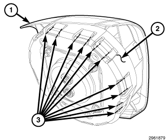 4. Using a sharp utility knife, carefully cut through the lower edge of each of the twelve trim cover (1) windows at the cut lines (3) on each side of the twelve inward pointing hooks of the airbag housing (2). Use extreme care to prevent any scraps from entering and becoming lost within the airbag housing or cushion.