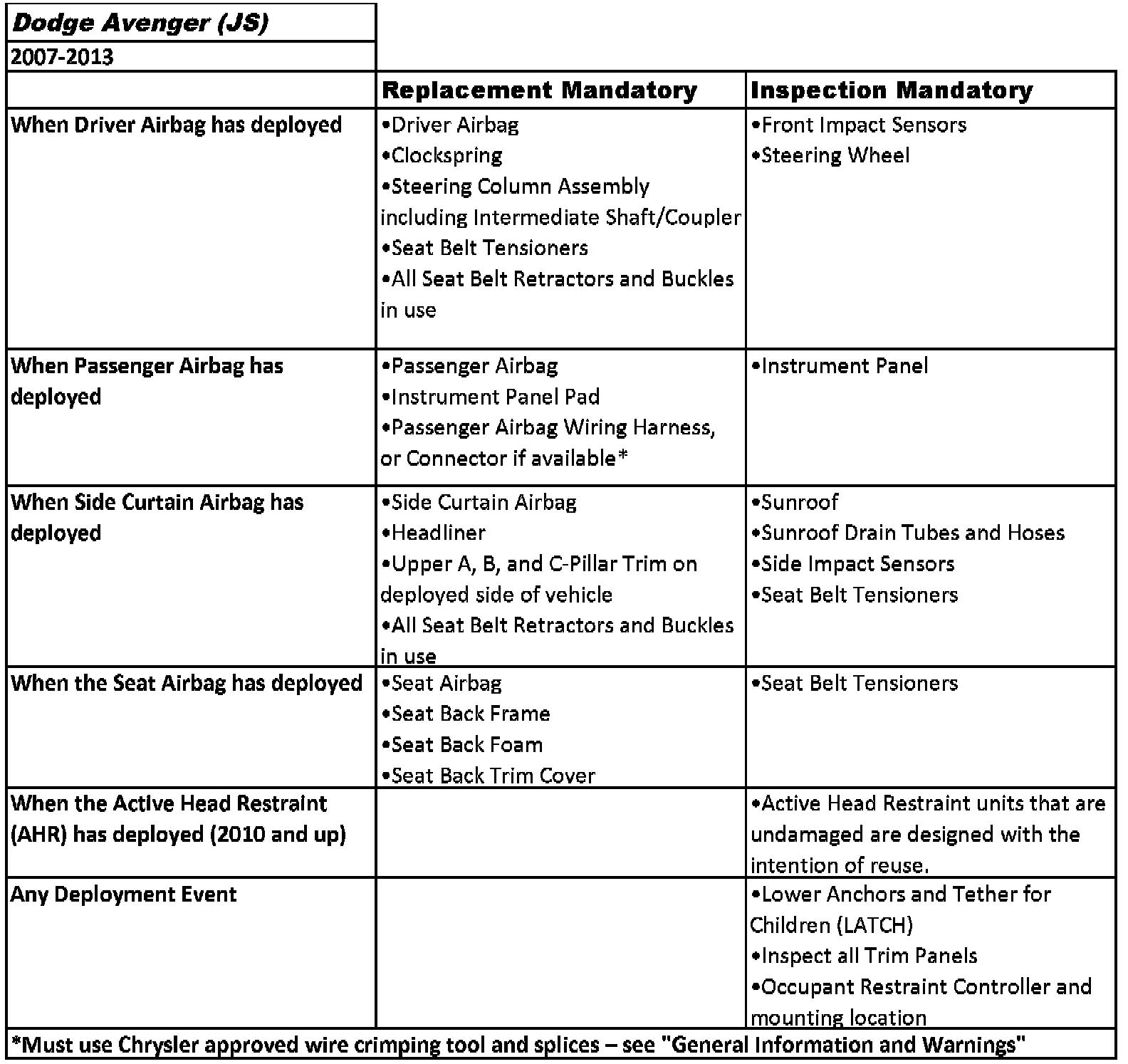 NOTE: Any vehicle which is to be returned to use following an SRS component deployment must have the deployed restraints replaced. All other vehicle components should be closely inspected following any SRS component deployment, but are to be replaced only as required by the extent of the visible damage incurred.