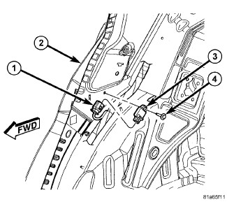 3. Remove the screw (4) that secures the side impact sensor (3) to the C-pillar (2).