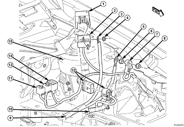 8. Remove the remote positive battery terminal (2) from mounting bracket on the left strut tower (15) by lifting straight up.