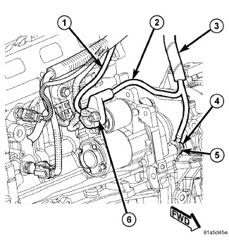 6. Remove the starter harness positive cable retaining nut (6) and remove the cable (2) from the starter positive battery post.