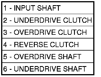 Three hydraulically applied input clutches are used to drive planetary components. The underdrive, overdrive, and reverse clutches are considered input clutches and are contained within the input clutch assembly. (Figure 1) input shaft (1), underdrive clutch (2), overdrive clutch (3), reverse clutch (4), overdrive shaft (5) and underdrive shaft (6). The input clutch assembly also contains: