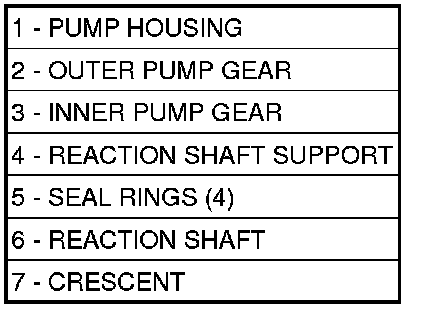 The oil pump is located in the pump housing inside the bell housing of the transmission case. The oil pump assembly (Figure 1) consists of an inner (3) and outer (2) gear, a housing (1), and a cover that also serves as the reaction shaft support (6).