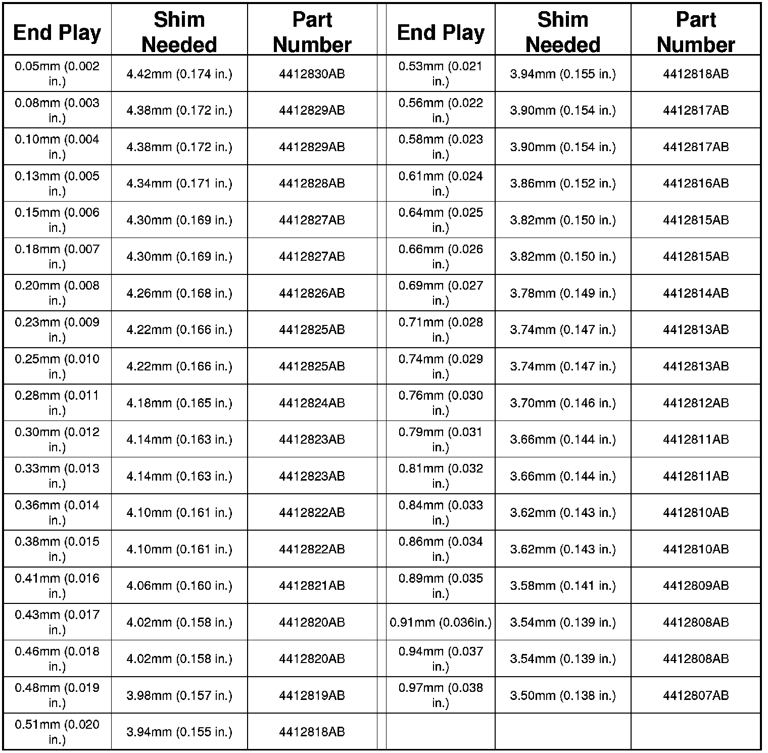OUTPUT GEAR BEARING SHIM CHART